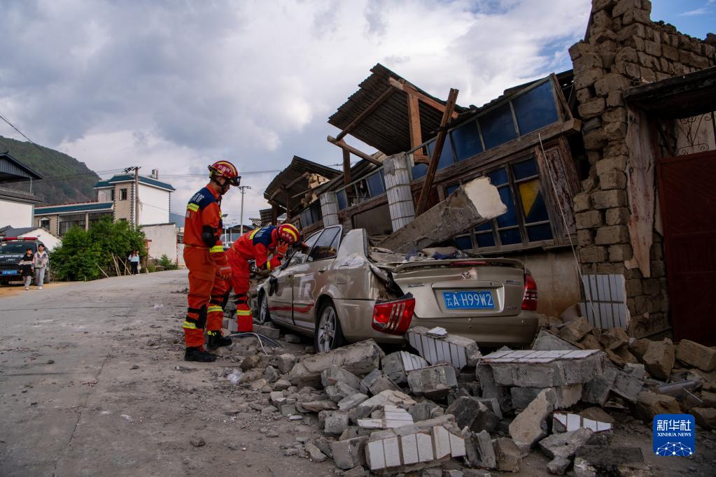 5月3日,應(yīng)急救援人員在云南省保山市隆陽區(qū)瓦窯鎮(zhèn)排查受損的房屋和車輛。