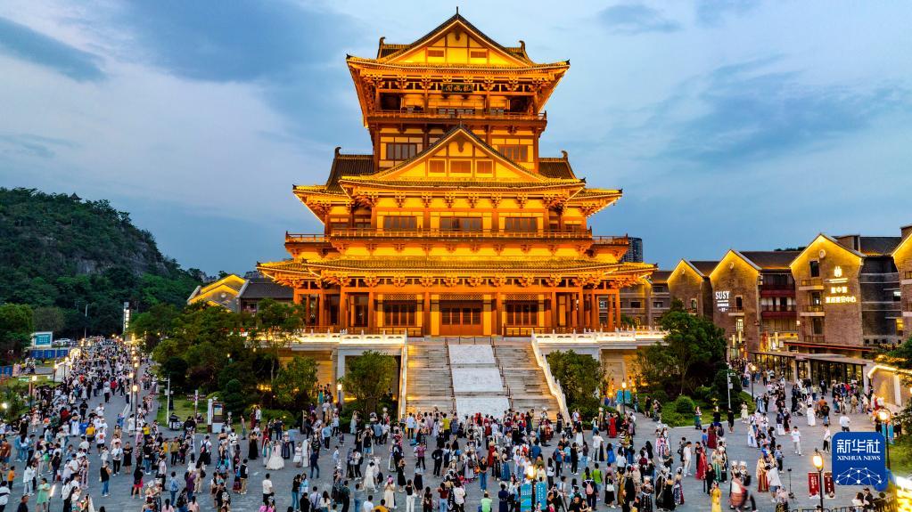 5月1日傍晚,廣西柳州市窯埠古鎮(zhèn)景區(qū)游人如織(無人機照片)。