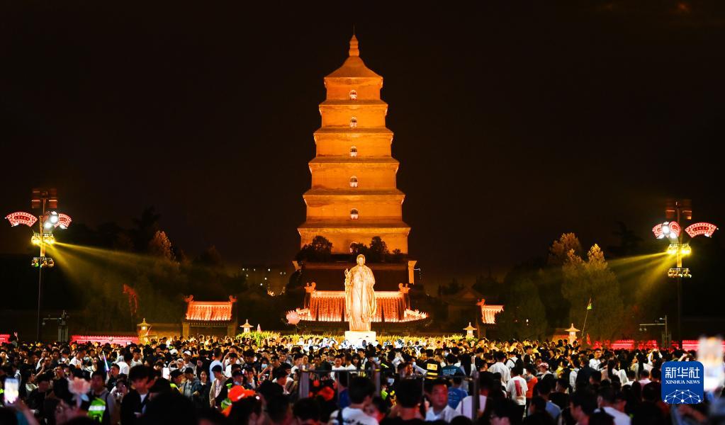 5月1日,游客在西安大唐不夜城步行街游覽。