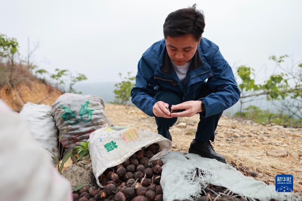 楊安仁檢查收獲的油桐果實(4月17日攝)。