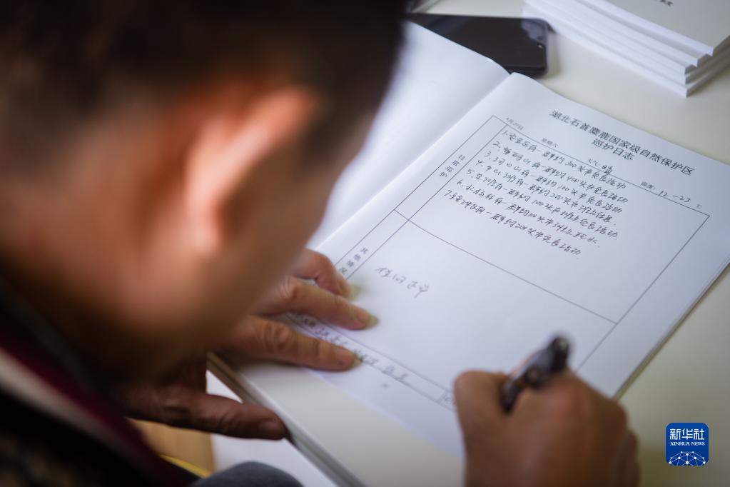 4月29日,在石首麋鹿國家級自然保護(hù)區(qū),巡護(hù)員劉吉高填寫巡護(hù)日志。