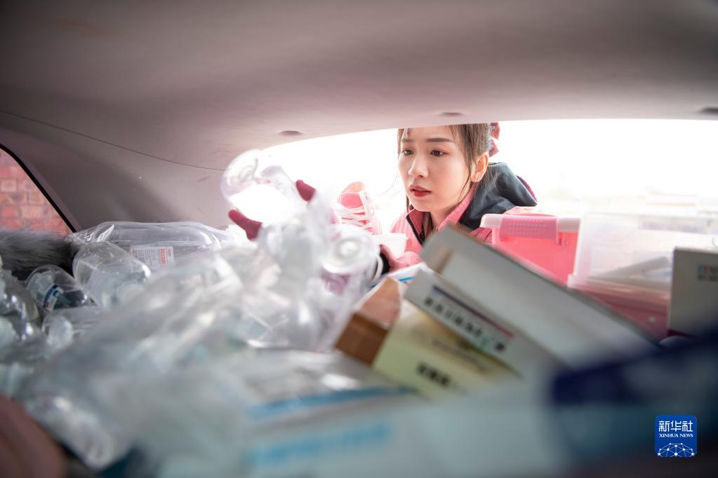 白婳從汽車后備箱里找取藥品(4月18日攝)。