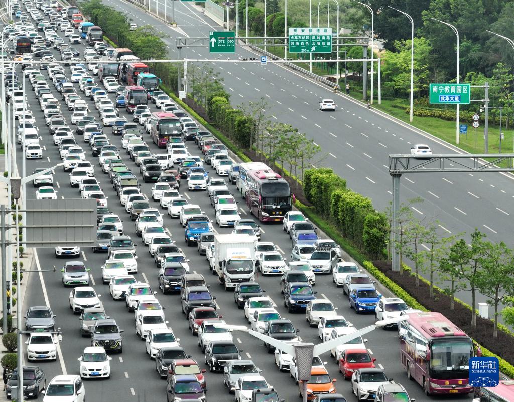 5月3日,返程車輛在廣西南寧市泉南高速進城路段排隊。