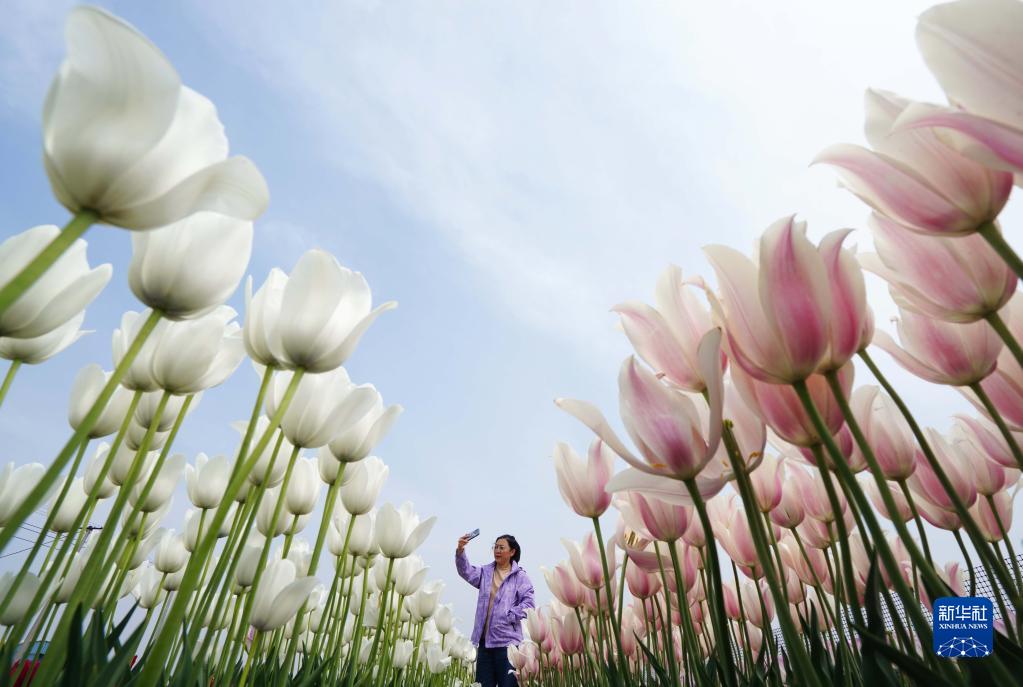 5月3日,游客在河北省灤南縣東黃坨鎮閆莊戶村郁金香種植基地拍照。