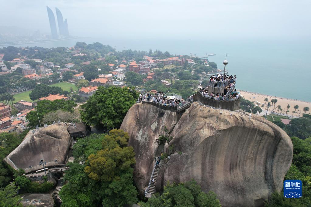 5月3日,游客在福建廈門鼓浪嶼日光巖游玩(無人機照片)。