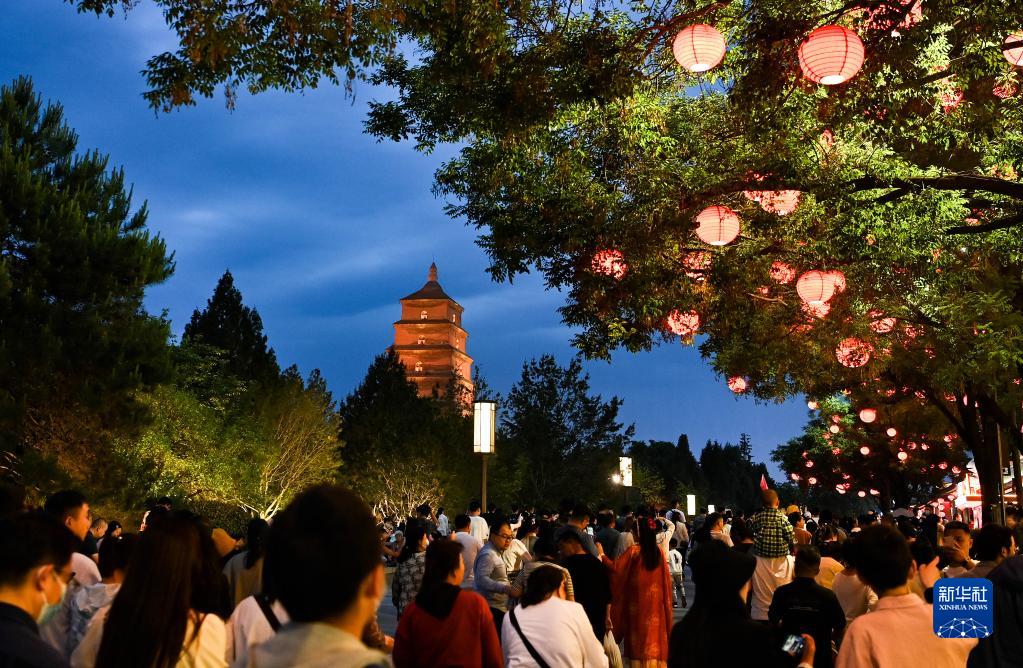 5月1日,游客在西安大雁塔文化休閑景區參觀游覽。