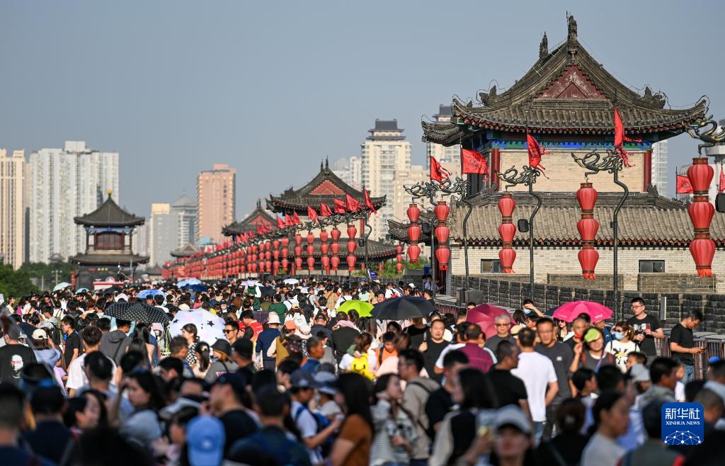 4月30日,游客在西安城墻景區參觀游覽。