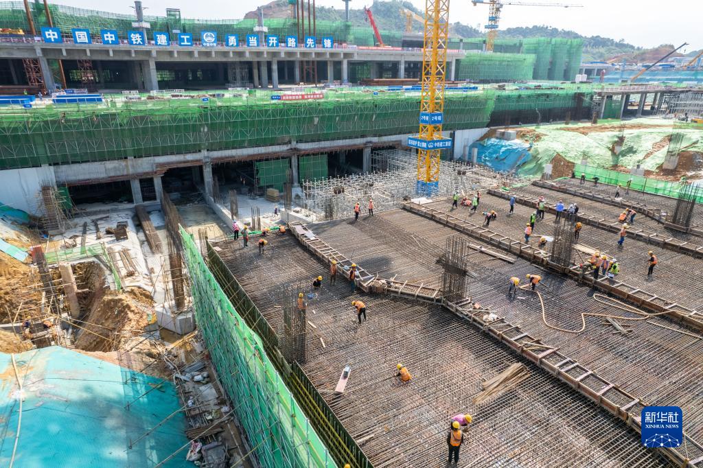 5月3日,在長沙西站建設工地,工人做混凝土澆筑前準備(無人機照片)。