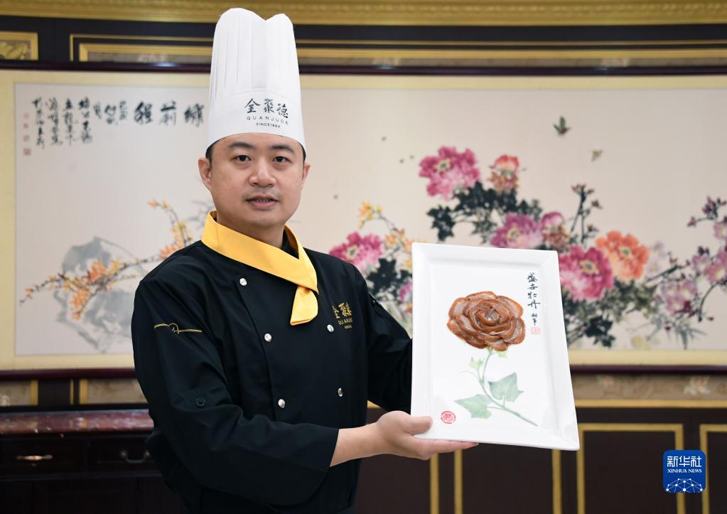 5月3日,在全聚德王府井店,夏志鵬展示盛世牡丹烤鴨。