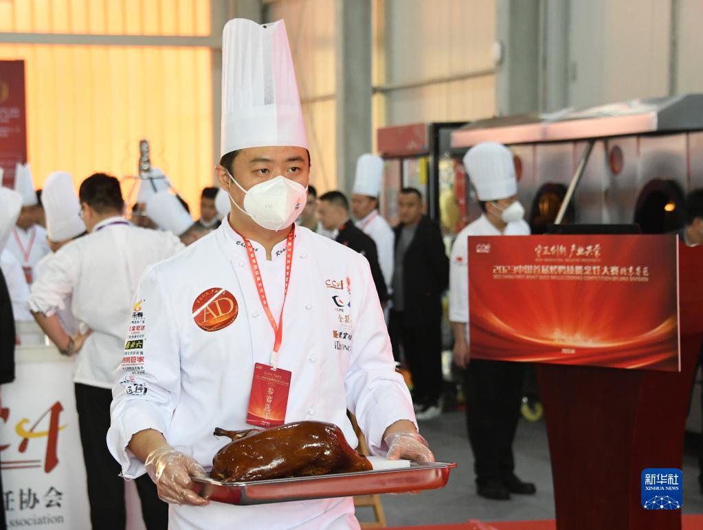 夏志鵬在2023中國首屆烤鴨技能烹飪大賽中端著烤制完成的烤鴨(4月24日攝)。