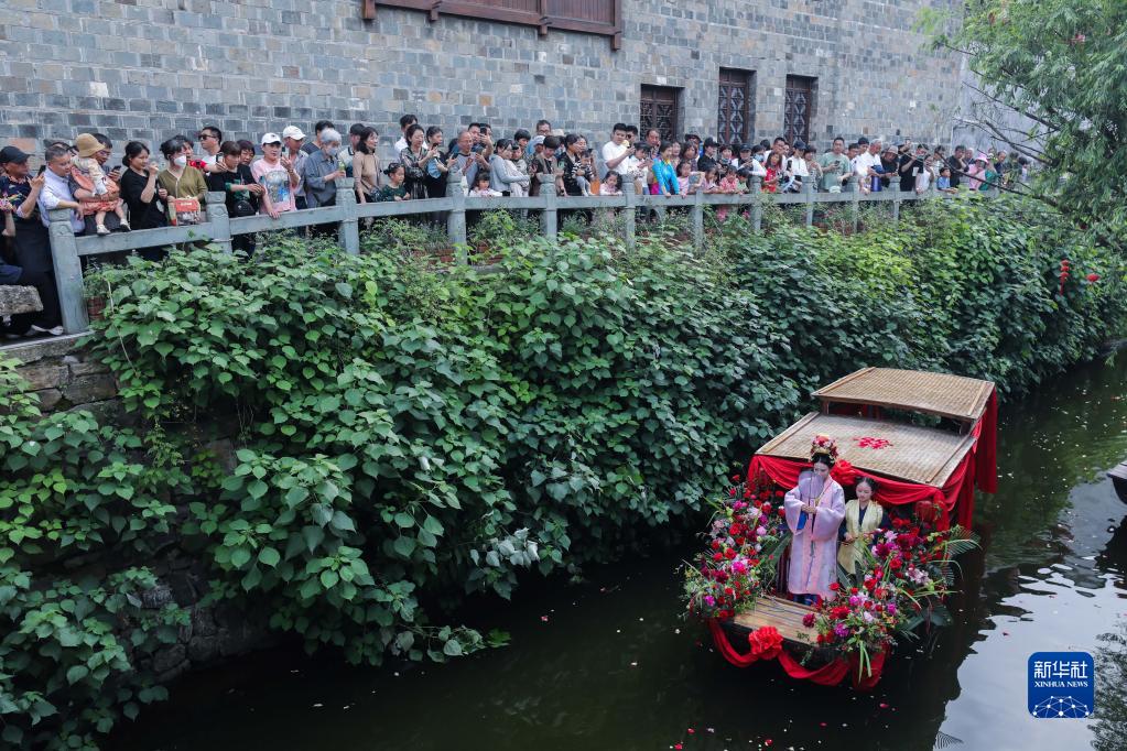 當(dāng)日,浙江省建德市梅城鎮(zhèn)嚴(yán)州古城舉行宋韻水上婚禮表演,通過出閣、梳妝、登船、親迎、禮拜的五幕演繹,吸引了人們駐足觀禮。有著1000多年歷史的嚴(yán)州古城地處新安江、富春江、蘭江交匯處,歷史文化積淀深厚。