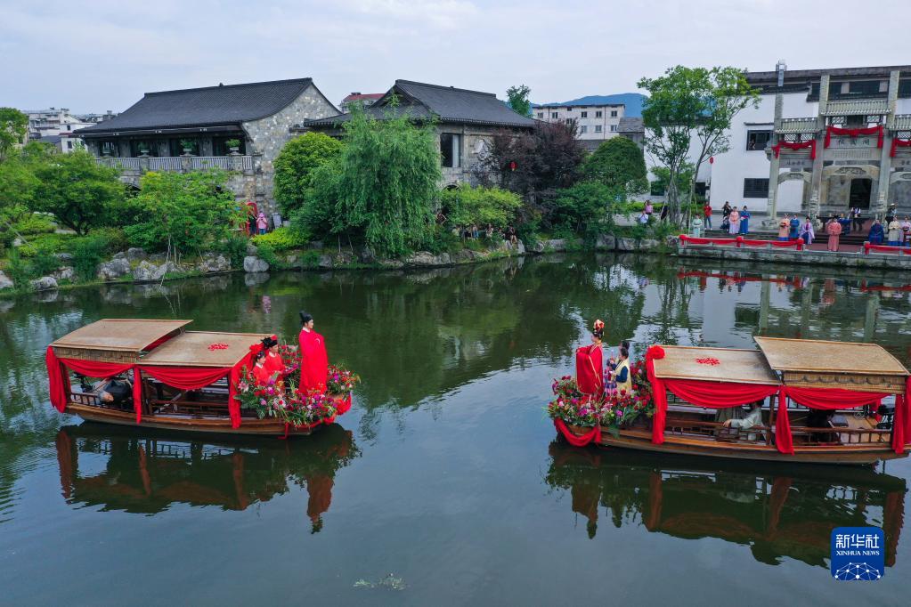 當日,浙江省建德市梅城鎮嚴州古城舉行宋韻水上婚禮表演,通過出閣、梳妝、登船、親迎、禮拜的五幕演繹,吸引了人們駐足觀禮。有著1000多年歷史的嚴州古城地處新安江、富春江、蘭江交匯處,歷史文化積淀深厚。