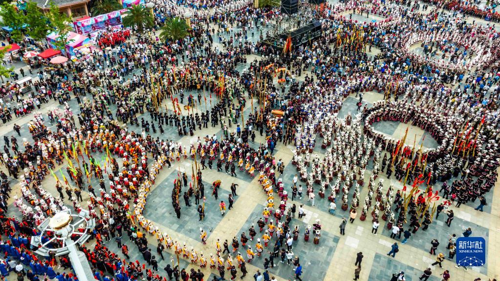 5月2日,人們在貴州省臺(tái)江縣姊妹廣場參加苗族姊妹節(jié)盛裝活動(dòng)(無人機(jī)照片)。