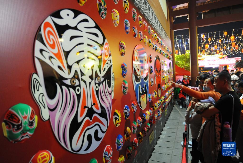 4月30日,游客在山東省滕州市“黃河大集·龍泉廟會”上觀賞京劇臉譜。