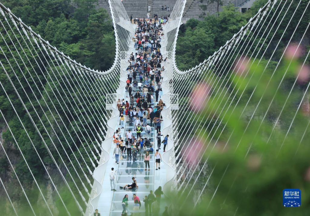5月2日,游人在湖南張家界大峽谷風景區(qū)體驗高空玻璃橋。