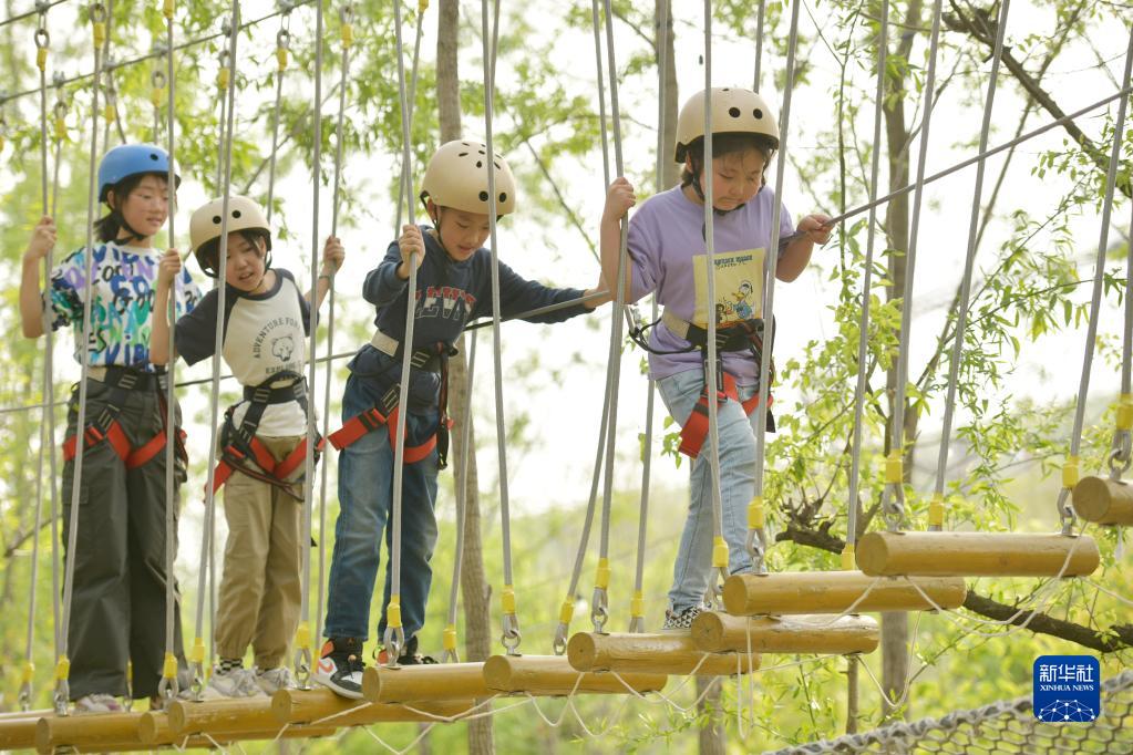 5月1日,在天津市薊州區下營鎮郭家溝景區內,孩子們體驗繩索挑戰項目。