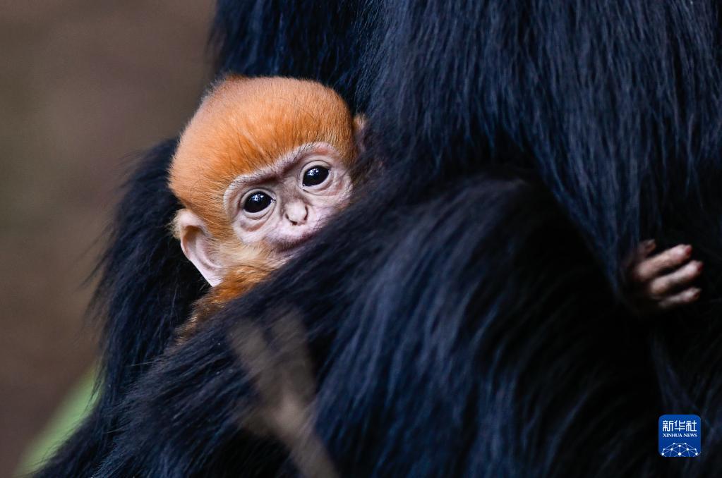 在貴州麻陽河國家級自然保護區(qū)拍攝的黑葉猴幼猴。新出生的黑葉猴毛色呈金黃色,幾個月后逐漸變成黑色(4月30日攝)。