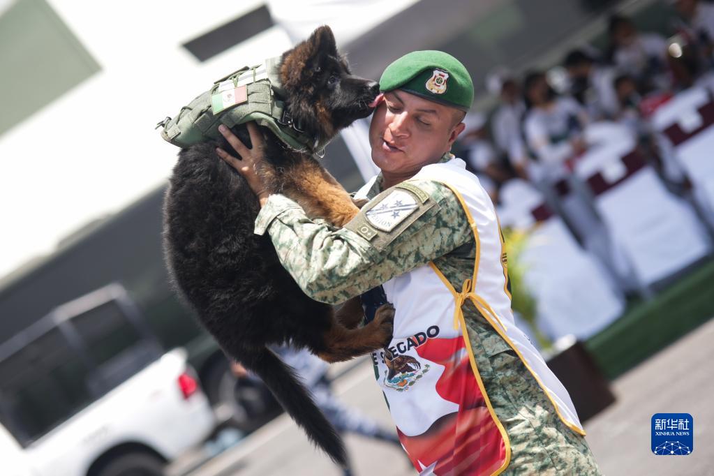 5月3日,在墨西哥瑙卡爾潘一處軍事基地,訓導員抱著土耳其贈送的小狗。