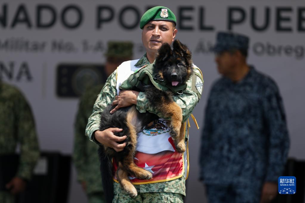 5月3日,在墨西哥瑙卡爾潘一處軍事基地,訓導員抱著土耳其贈送的小狗。