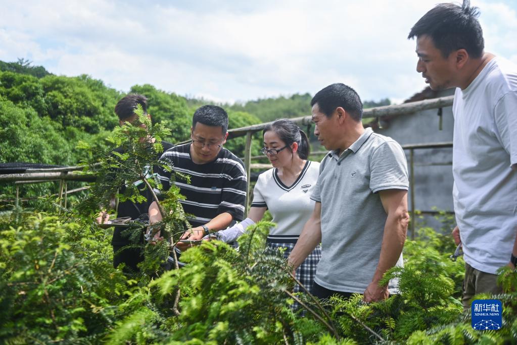 5月4日,90后青創客金志鵬(左二)指導東白湖鎮的種植戶們挑選和修剪香榧盆景。