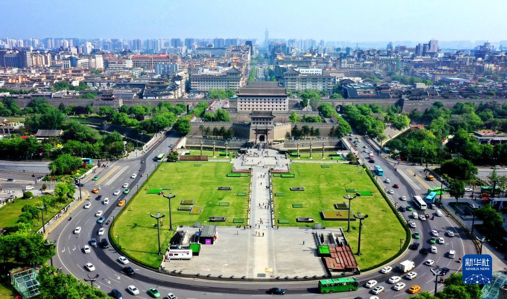 西安城墻景區永寧門文化廣場(4月25日攝,無人機照片)。