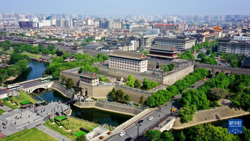 西安城墻景區永寧門(4月25日攝,無人機照片)。