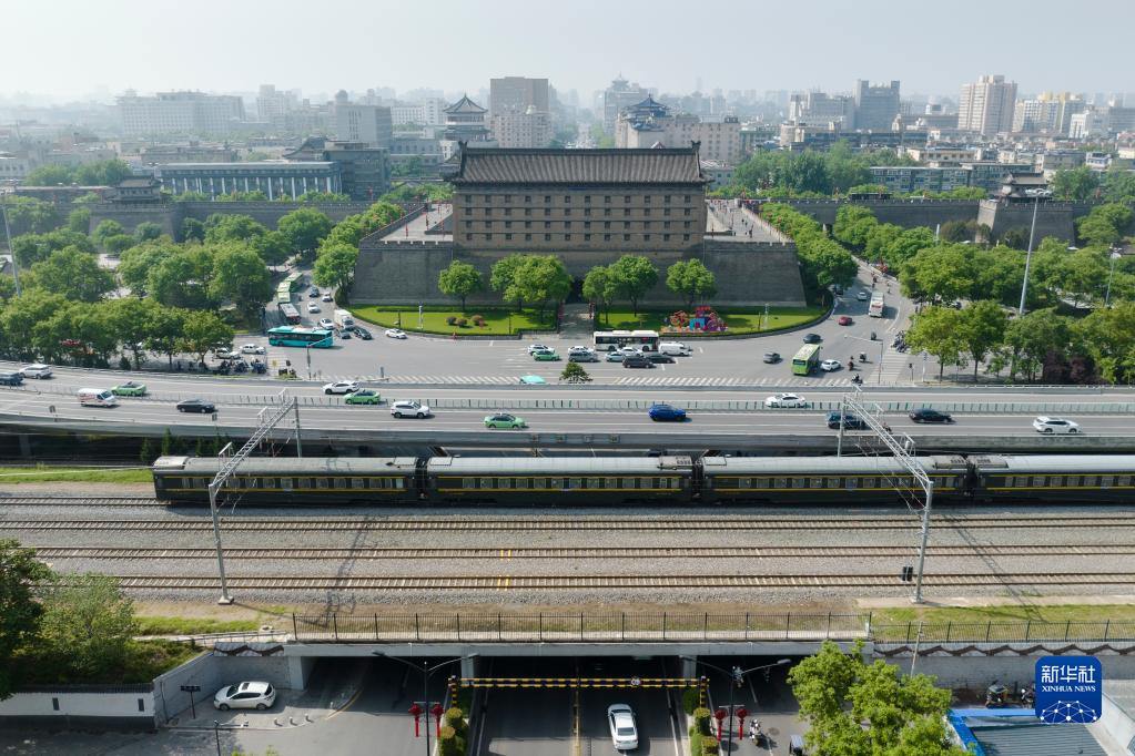 一列火車從西安城墻安遠門前駛過(4月25日攝,無人機照片)。