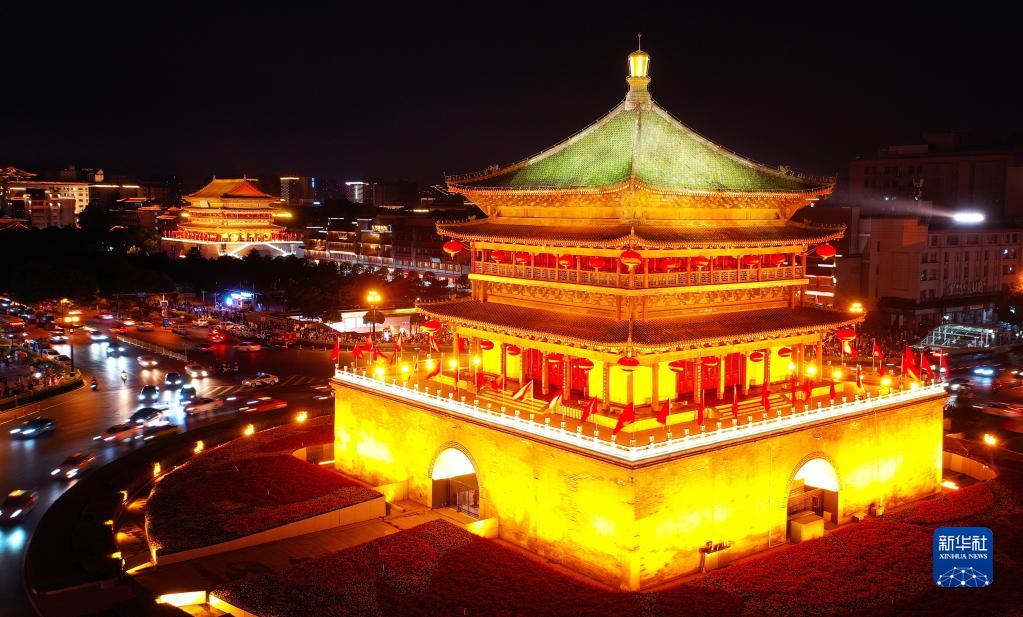 西安鐘樓夜景(5月2日攝,無人機照片)。
