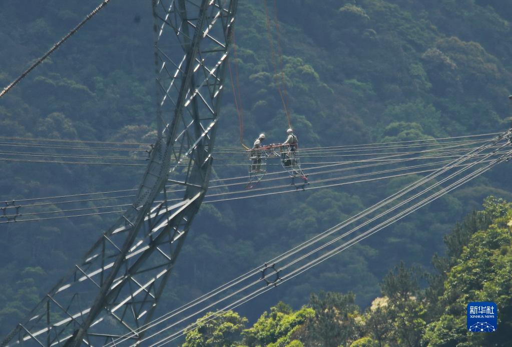 5月4日,在福建省寧德市洪口鄉,國網福建超高壓公司帶電班檢修工周曉剛(右)對輸電線路進行帶電作業。