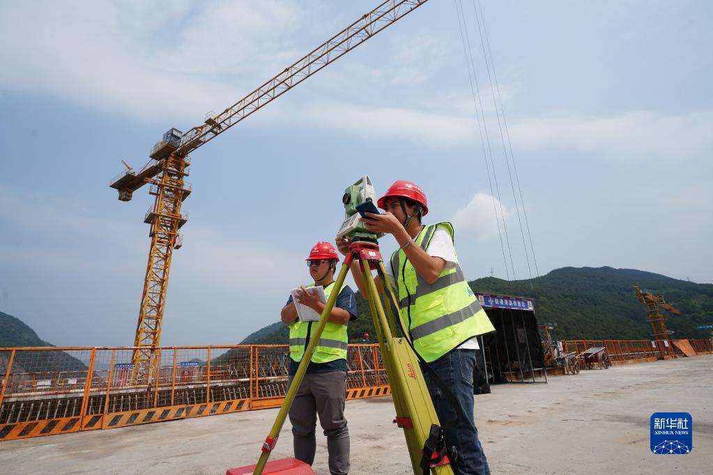 5月4日,在重慶市北碚區渝武高速復線觀音峽嘉陵江特大橋,中交一公局四公司橋梁工區工作人員孫培耕(左)和彭昭屏在對橋面高程及軸線偏位進行測量。