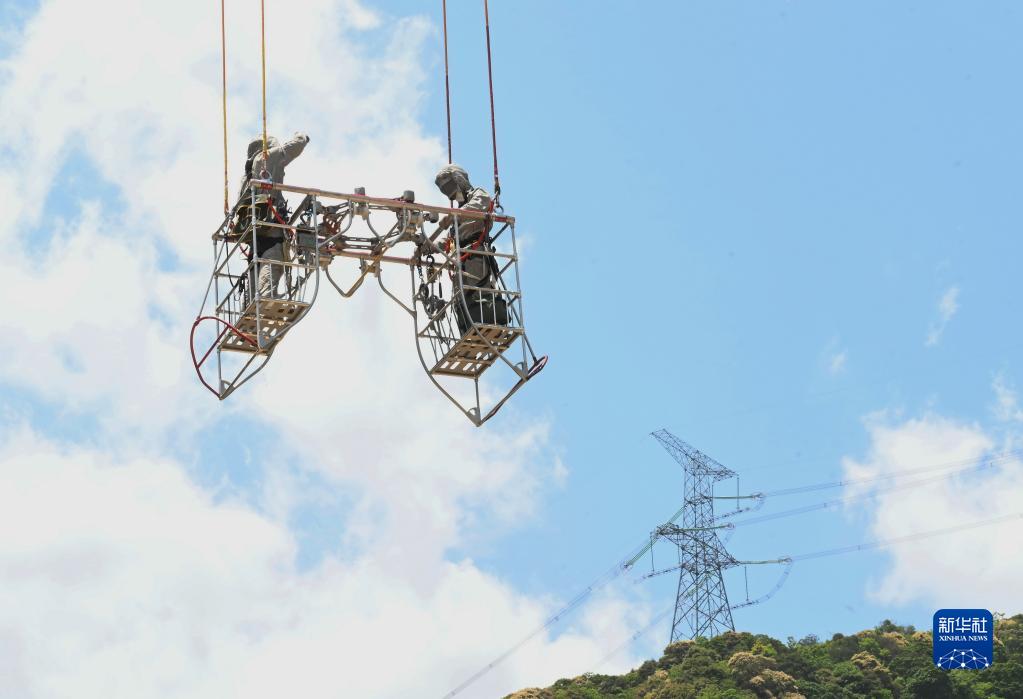 5月4日,在福建省寧德市洪口鄉(xiāng),直升機將國網(wǎng)福建超高壓公司帶電班檢修工周曉剛(右)吊往檢修點開展輸電線路帶電檢修作業(yè)。