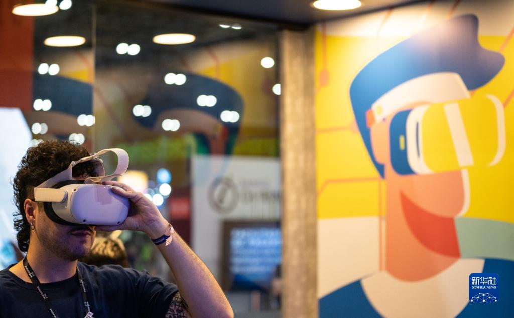 5月4日,在巴西里約熱內盧舉行的里約網絡峰會上,一名參會者在巴西銀行展臺體驗VR設備。
