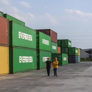5月4日,諸暨市財政部門工作人員(左)到海鐵聯運中心查看外貿貨物運輸情況。