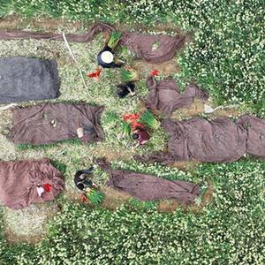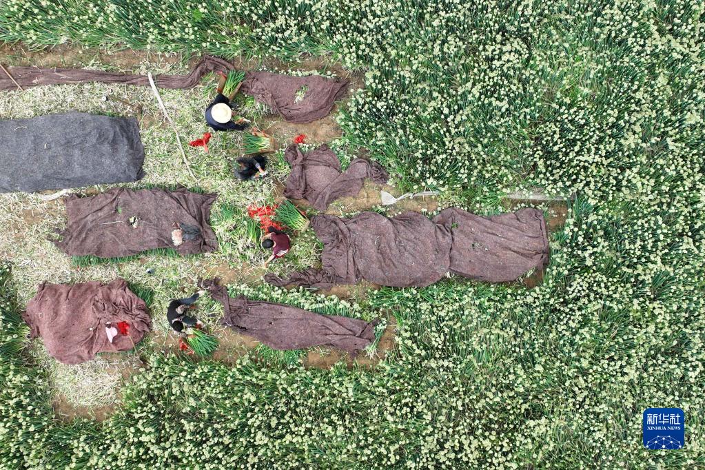 5月17日,河北省柏鄉縣馬村農民在收獲香蔥(無人機照片)。