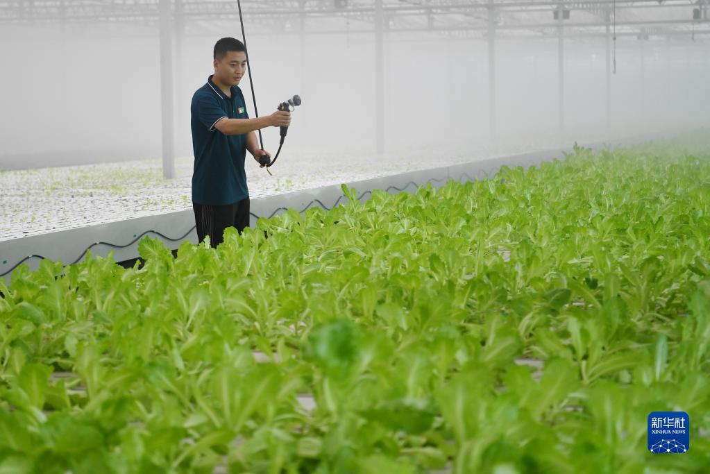 5月17日,饒陽縣一處高品質蔬菜產業園的工作人員在設施溫室對水培蔬菜進行管護。