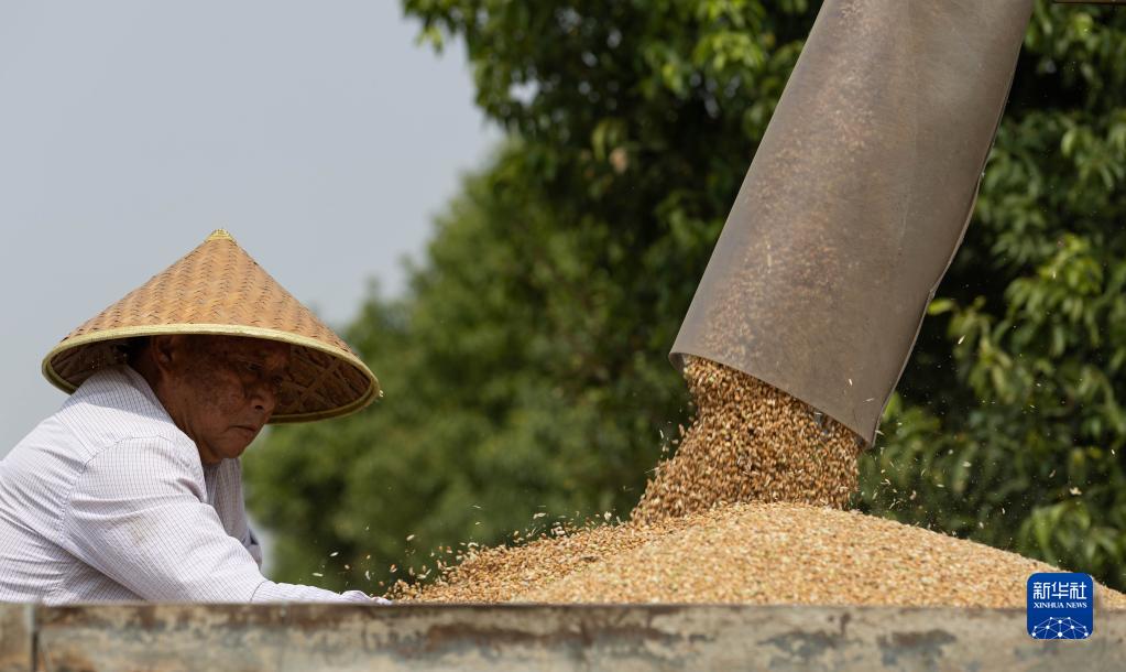 5月17日,在廣漢市小漢鎮(zhèn)團結(jié)村,收割機收獲的小麥顆粒歸倉。