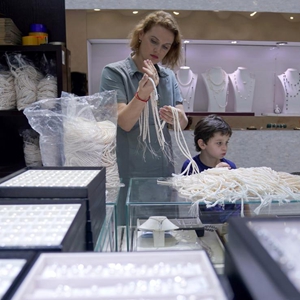 5月17日,浙江省諸暨市山下湖鎮(zhèn)華東國際珠寶城,一名來自俄羅斯的批發(fā)商選購珍珠項(xiàng)鏈。