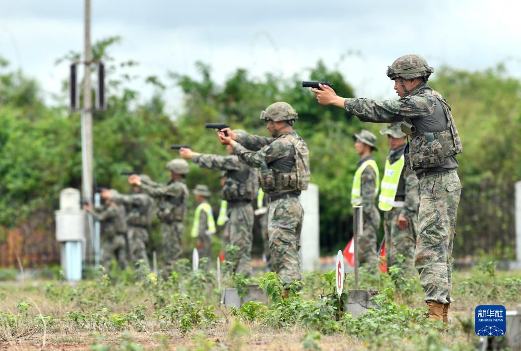 5月13日,在老撾人民軍庫瑪丹學院訓練場,中方參演官兵進行手槍射擊示范。