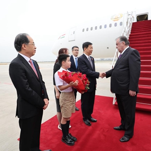 5月17日下午,出席中國-中亞峰會的塔吉克斯坦總統(tǒng)拉赫蒙抵達陜西省西安市。