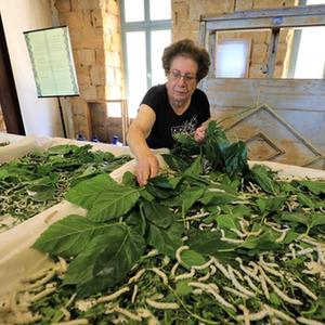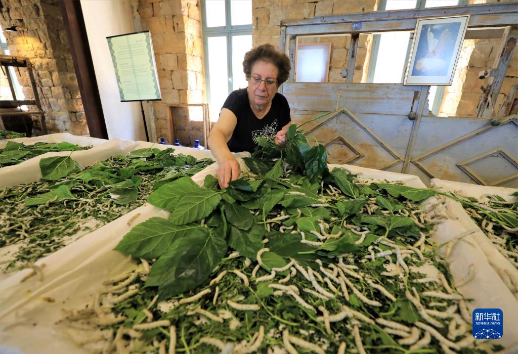 5月17日,在黎巴嫩卜蘇斯絲綢博物館,工作人員用桑葉喂蠶。