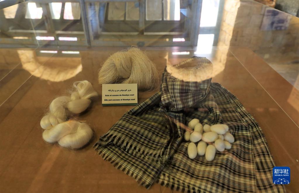 這是5月17日在黎巴嫩卜蘇斯絲綢博物館拍攝的蠶繭、蠶絲和絲織品。