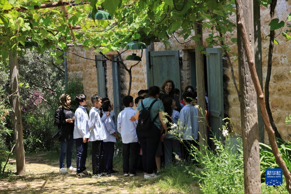 5月17日,在黎巴嫩卜蘇斯絲綢博物館,導游為當地學生講解。