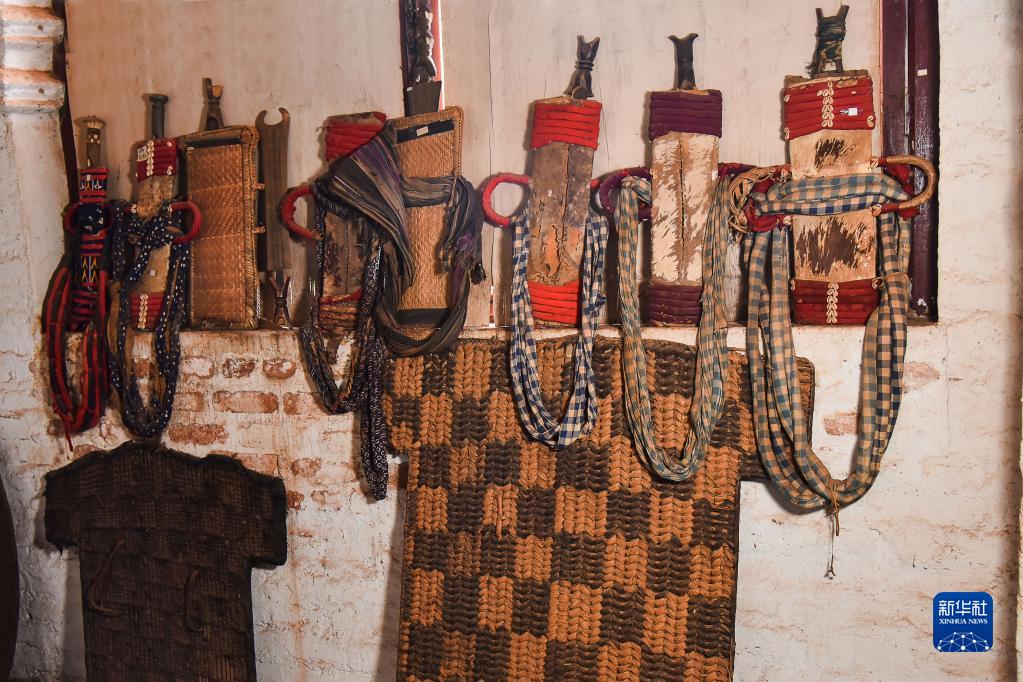 這是4月12日在喀麥隆西部大區豐班的巴蒙王宮博物館拍攝的過去巴蒙戰士使用的武器。