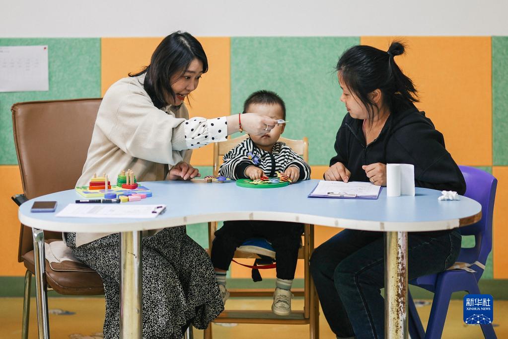 在吉林省聾兒語言聽力康復(fù)中心,一名小朋友在教師與母親的陪伴下進(jìn)行一對一聽覺訓(xùn)練(5月17日攝)。