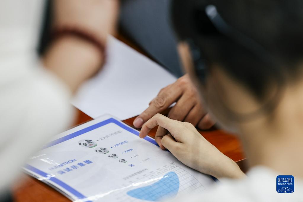 在吉林長春,一名小朋友在進行人工耳蝸首次開機調試時指向示意圖上“聽到中等聲”標識(5月15日攝)。