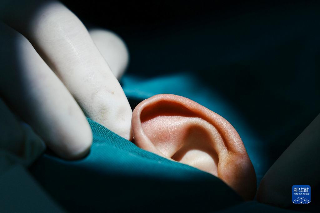 在吉林大學白求恩第一醫院,醫護人員在完成人工耳蝸植入手術后檢查患兒切口縫合情況(5月15日攝)。
