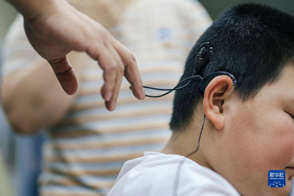 在吉林長春,人工耳蝸產(chǎn)品方技術(shù)服務(wù)人員為一名小朋友進(jìn)行人工耳蝸首次開機(jī)調(diào)試(5月15日攝)。