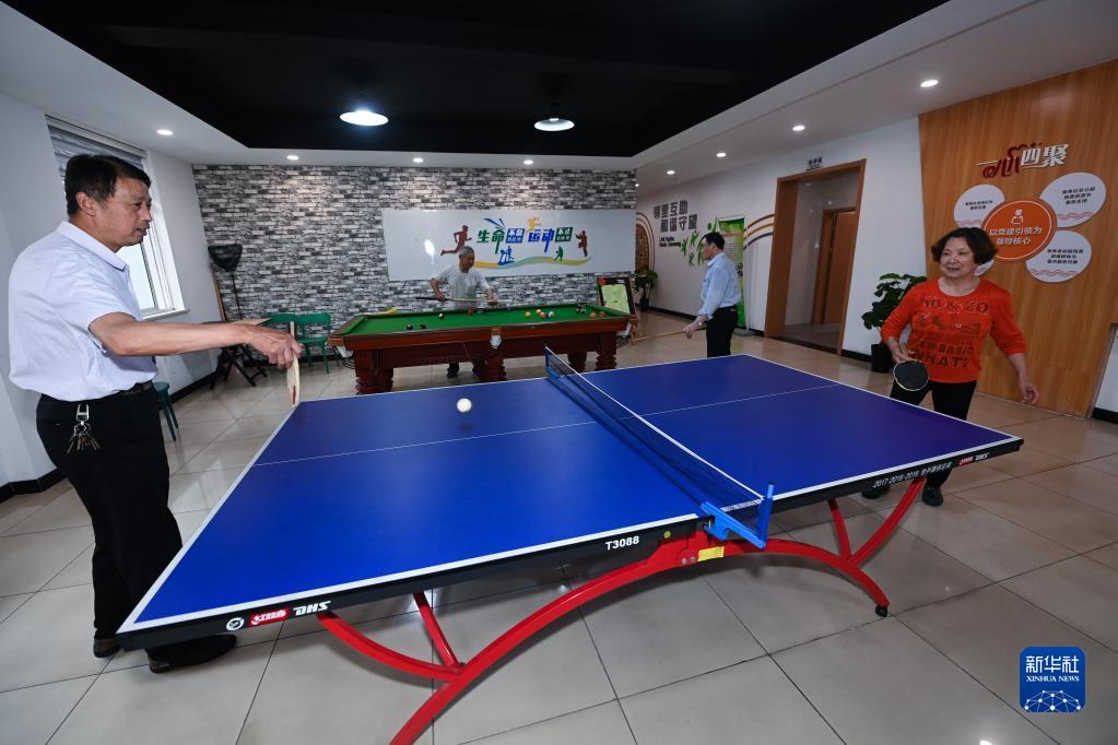 5月18日,老人們在織里鎮晟舍村居家養老服務中心打乒乓球。