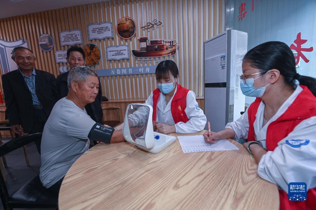 5月18日,志愿者在織里鎮晟舍村居家養老服務中心為老人進行健康體檢。