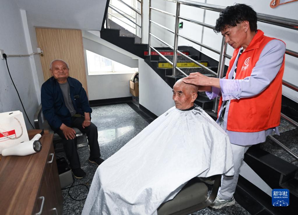 5月18日,志愿者在織里鎮(zhèn)晟舍村居家養(yǎng)老服務(wù)中心為老人進(jìn)行義務(wù)理發(fā)。